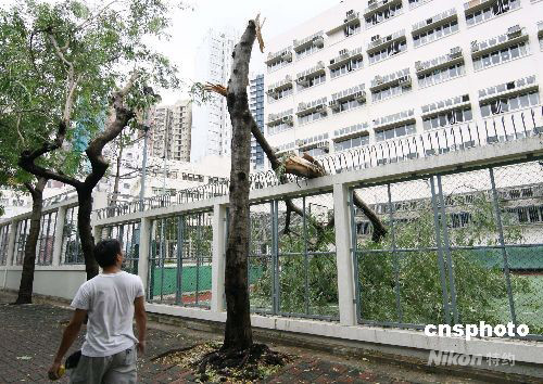 臺(tái)風(fēng)“黑格比”襲過香港后,九月二十四日早減弱為三號(hào)強(qiáng)風(fēng),香港所有上午校及全日制學(xué)校繼續(xù)停課。圖為灣仔區(qū)一棵大樹被吹折,倒落于一中學(xué)的操場(chǎng)內(nèi)。中新社發(fā) 武仲林 攝