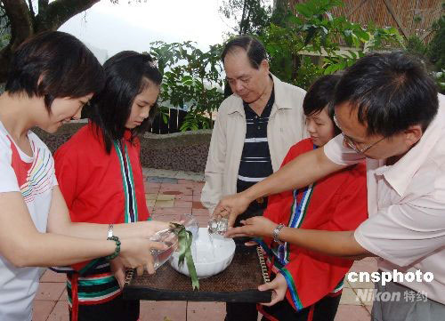 十月二日,參加“2008·陽光海峽”兩岸快樂小天使活動(dòng)營(yíng)的兩岸小天使在日月潭畔舉行換水儀式。來自福建閩江的水和臺(tái)灣日月潭的水,在兩岸小天使的見證下溶為一體。圖為該活動(dòng)營(yíng)領(lǐng)隊(duì)、福建省廣播影視集團(tuán)電視少兒頻道總監(jiān)覃曉清(左)與臺(tái)灣南投德化小學(xué)校長(zhǎng)梁有章(右)在該換水儀式上共同將兩地的水溶為一體。中新社發(fā) 劉可耕 攝