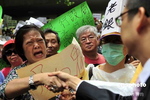 十月八日,過百名受雷曼迷你債券事件影響的香港市民,在香港立法會前請愿。圖為民建聯(lián)立法會議員劉江華(右)與請愿者會面。中新社發(fā) 譚達明 攝