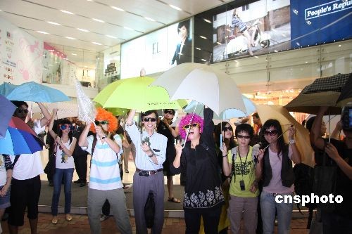十月十日晚,香港一環(huán)保團(tuán)體組織了一次五分鐘的反對光污染“快閃”行動。手持五顏六色雨傘、佩戴墨鏡的抗議者在皇室堡商場門前的行人路上“漫游”。中新社發(fā) 陳京松 攝