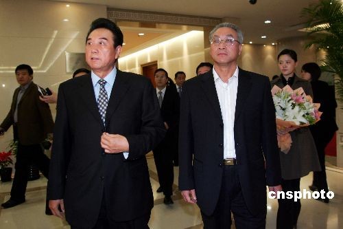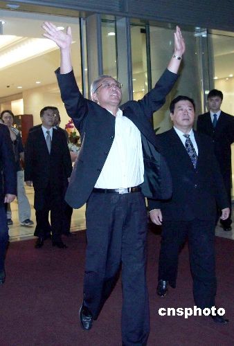 圖為海協(xié)會(huì)會(huì)長(zhǎng)陳云林在機(jī)場(chǎng)迎接張銘清(右)。