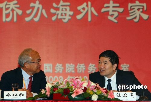 10月27日,第二屆國務院僑辦海外專家咨詢委員會會議在北京舉行。圖為國務院僑務辦公室副主任任啟亮(右)與華裔美籍電機工程學家卓以和(左)在會上交流。中新社發(fā) 廖文靜 攝