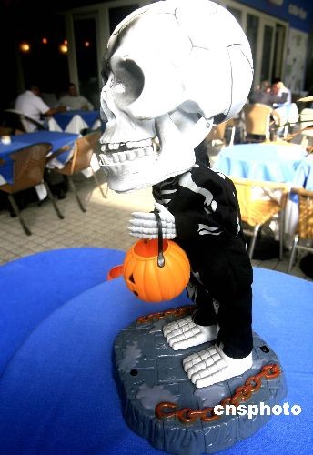 十月三十一日傍晚,香港一家酒吧為迎接前來歡度“萬圣節(jié)”的中外游客,特意在門外安裝“鬼燈”。中新社發(fā) 張勤 攝