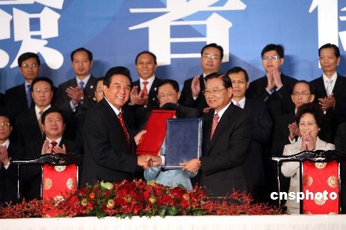 十一月四日,海協(xié)會(huì)與;鶗(huì)在臺(tái)北圓山飯店舉行歷史性的會(huì)談后,大陸海協(xié)會(huì)會(huì)長陳云林與臺(tái)灣;鶗(huì)董事長江丙坤下午十四時(shí)許在臺(tái)北就兩岸海運(yùn)、空運(yùn)、郵政、食品安全等議題簽署四項(xiàng)協(xié)議。中新社發(fā) 洪少葵 攝