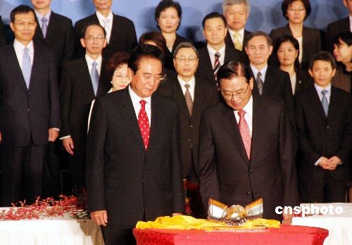 11月4日下午,海協(xié)會(huì)會(huì)長陳云林和;鶗(huì)董事長江丙坤簽署有關(guān)兩岸空運(yùn)直航、海運(yùn)直航、郵政、食品安全的4項(xiàng)協(xié)議。圖為協(xié)議文本簽署后,陳云林向江丙坤致贈(zèng)水晶作品《握手》。中新社發(fā) 黃少華 攝