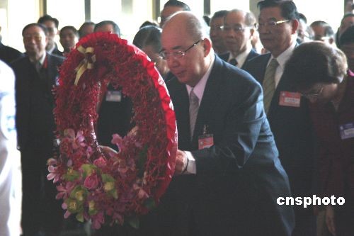 11月22日,中國國民黨第十七次全代會臨時會議在臺北“國父紀念館”舉行。圖為會議前,國民黨主席吳伯雄率黨內(nèi)同仁在紀念館內(nèi)向中山先生銅像獻花致敬。中新社發(fā) 劉舒凌 攝