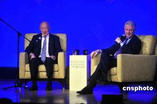 圖為克林頓與新加坡資政李光耀(左)進(jìn)行對話。