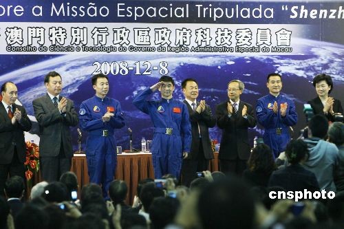 十二月八日,“神舟七號”載人航天飛行代表團在澳門舉行報告會。代表團團長、中國載人航天工程副總指揮張建啟、中國航天員翟志剛、劉伯明、景海鵬,以及載人航天工程有關(guān)系統(tǒng)的負責(zé)人等出席。中新社發(fā) 武仲林 攝