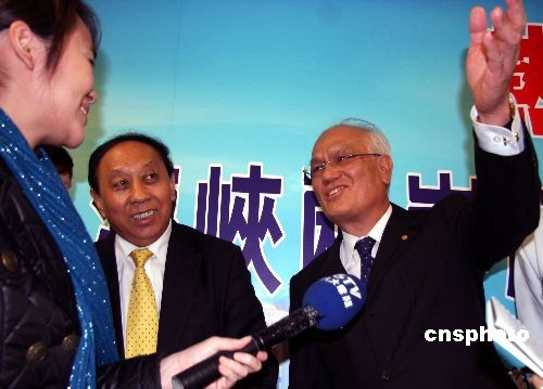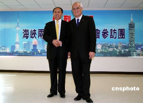臺灣海峽兩岸航運(yùn)協(xié)會(“臺航會”)12月8日上午在臺北與來訪的海峽兩岸航運(yùn)交流協(xié)會(“海航會”)參訪團(tuán)座談。圖為海峽兩岸航運(yùn)交流協(xié)會理事長胡漢湘和“臺航會”董事長、長榮海運(yùn)董事長王龍雄在座談會中。胡漢湘說,兩岸航商爭先恐后要求參加首航,兩岸將同步行動,慶祝海運(yùn)首航。中新社發(fā) 劉舒凌 攝