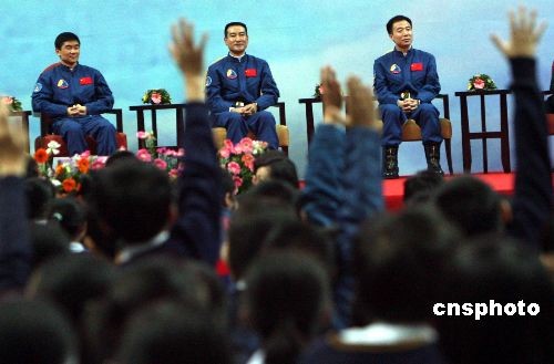 十二月九日,“神舟七號(hào)”載人航天飛行代表團(tuán)一行在澳門理工學(xué)院與澳門學(xué)生真情對(duì)話,分享太空之旅的經(jīng)過和感想。中新社發(fā) 武仲林 攝