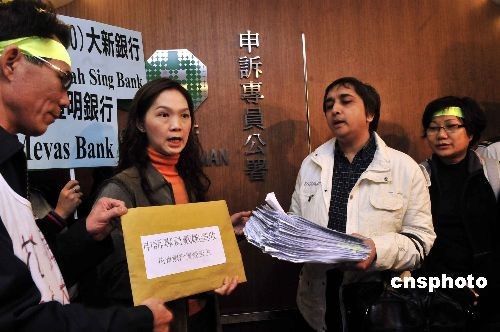 十二月十二日,香港數(shù)百名購買了雷曼相關(guān)產(chǎn)品的市民發(fā)起游行。圖為苦主代表向申訴專員公署投訴金融管理局監(jiān)管不力。中新社發(fā) 譚達(dá)明 攝