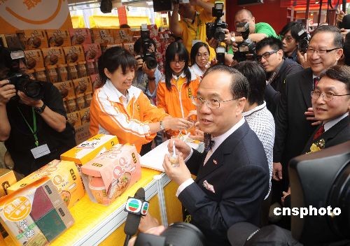 十二月十三日,香港第四十三屆工展會(huì)在維多利亞公園開(kāi)幕,香港行政長(zhǎng)官曾蔭權(quán)伉儷在會(huì)場(chǎng)內(nèi)參觀,并購(gòu)買(mǎi)了五十包餅干禮包、五十份河粉禮包,以及一盒鮑魚(yú)面,消費(fèi)超過(guò)五千元。圖為曾蔭權(quán)在試食粉面。中新社發(fā) 鄧慶樂(lè) 攝