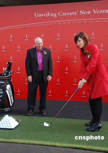 美國哈樂斯娛樂公司十二月十六日在澳門公布“凱撒高爾夫”發(fā)展計劃,包括開設(shè)亞洲首間布奇哈蒙高爾夫?qū)W校以及對現(xiàn)有高爾夫球場的提升改造。圖為著名高爾夫球教練布奇·哈蒙指導“澳門小姐”呂蓉茵揮桿動作。中新社發(fā) 畢永光 攝