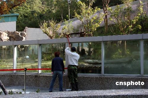 12月18日上午,臺(tái)北市動(dòng)物園進(jìn)行“游客參觀大貓熊動(dòng)線測試”演練,檢驗(yàn)動(dòng)物園方面目前所規(guī)劃的館內(nèi)教育展示解說、游客流量、流速及動(dòng)線順暢度。圖為工人在為“團(tuán)團(tuán)”、“圓圓”新家做護(hù)墻保潔。中新社發(fā) 劉舒凌 攝