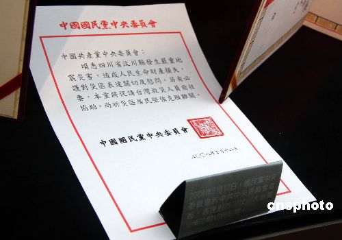 正在臺(tái)北中國(guó)國(guó)民黨中央黨部黨史展覽廳舉辦的“跨越三世紀(jì)——中國(guó)國(guó)民黨的變與不變”展覽,展出許多珍貴史料。圖為2008年5月12日,中國(guó)國(guó)民黨中央委員會(huì)就汶川大地震向中國(guó)共產(chǎn)黨中央委員會(huì)發(fā)出的電函。中新社發(fā) 陳立宇 攝