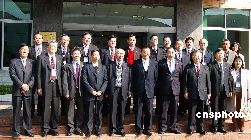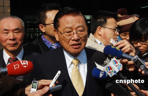 一月九日上午,海協(xié)會與;鶗(lián)合參訪團在廣州考察一家臺資企業(yè)?疾旖Y(jié)束后,臺灣海基會董事長江丙坤接受兩岸記者聯(lián)合采訪。中新社發(fā) 柯小軍 攝