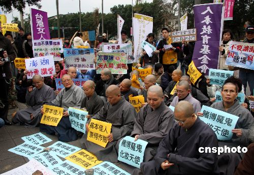 1月12日,臺(tái)灣“立法院”將表決離島建設(shè)條例部分條文修正草案,即博弈條款。圖為約百名反賭博合法化聯(lián)盟的成員,當(dāng)天上午到“立法院”門口陳情抗議,表達(dá)反賭博合法化立場(chǎng)。中新社發(fā) 陳立宇 攝