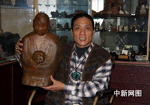 臺灣知名殘障木雕家林正發(fā),年青時不幸因車禍而不良于行。但并沒因此喪志。反而一心致力于木雕藝術(shù)的創(chuàng)作。成為一個自食其力的人。曾多次獲臺灣木雕比賽大獎。圖為林正發(fā)和他的新作“佑”。以抽象的藝術(shù)手法來表現(xiàn)虔誠的宗教觀念。