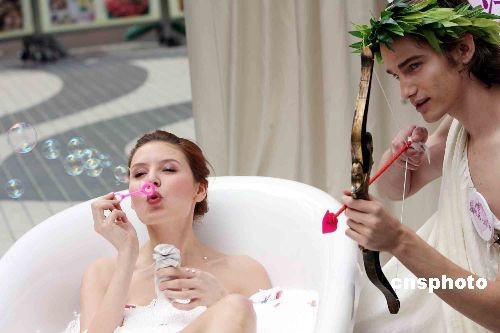 二月五日,為迎接情人節(jié),香港一家商場(chǎng)在銅鑼灣鬧市街頭上演美人出浴,推介情人節(jié)沐浴套裝,化身“愛(ài)神”丘比特的模特也來(lái)湊熱鬧,一起預(yù)祝情人節(jié)甜甜蜜蜜沐浴愛(ài)河。中新社發(fā) 洪少葵 攝