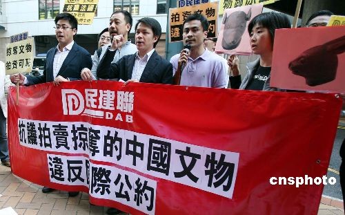 二月二十四日,香港民建聯(lián)一批成員到法國駐港領(lǐng)事館抗議,譴責(zé)法國佳士得拍賣行準(zhǔn)備拍賣兩件中國圓明園獸首國寶銅像。中新社發(fā) 洪少葵 攝