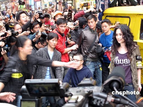 三月十一日,藝人不雅照女主角之一的鐘欣桐(阿嬌)復(fù)出后首次現(xiàn)身香港鬧市街頭,引來數(shù)百人圍觀,爭相拍攝。阿嬌復(fù)出后首份工作是擔(dān)任一個牛仔褲品牌的代言人,當(dāng)日出席該品牌一分店的宣傳活動。中新社發(fā) 黎金良 攝