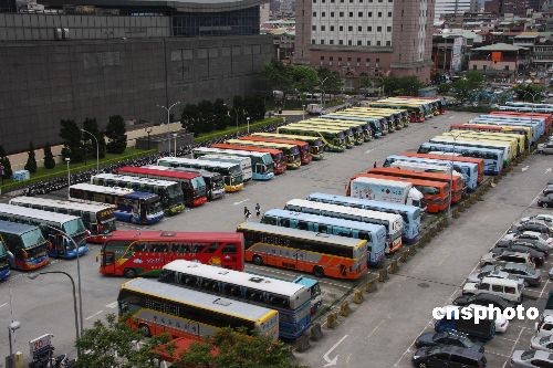 從今年三月起,到臺(tái)灣的大陸游客驟增,日抵人數(shù)甚至突破七千人。以大陸游客在臺(tái)灣停留六至十天計(jì),每天停留在臺(tái)灣的大陸游客有數(shù)萬(wàn)人,以致游覽車(chē)不夠用。圖為在大陸游客參觀點(diǎn)臺(tái)北101大樓的附近停車(chē)場(chǎng)停滿旅游團(tuán)車(chē)輛。臺(tái)灣觀光局四月二十六日緊急研商決定,供大陸游客使用的游覽車(chē)車(chē)齡由七年放寬到十年,以增加一千三百六十輛游覽車(chē)緩解車(chē)輛不足。中新社發(fā) 耿軍 攝