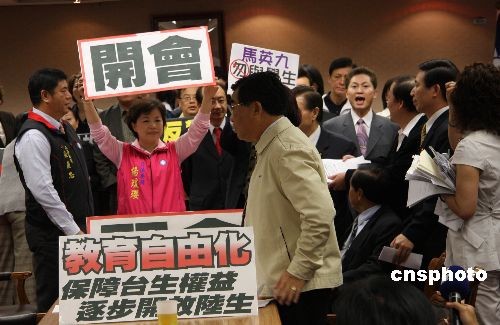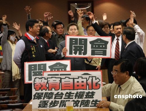 5月4日上午,臺(tái)灣“立法院”內(nèi)政委員會(huì)原定審查事關(guān)大陸學(xué)歷認(rèn)證、開放大陸學(xué)生來臺(tái)的兩岸人民關(guān)系條例部分條文修正草案。民進(jìn)黨團(tuán)總動(dòng)員,杯葛內(nèi)政委員會(huì)議事進(jìn)行,并占據(jù)主席臺(tái)。民進(jìn)黨團(tuán)提散會(huì)動(dòng)議,以八比七的票數(shù)未能通過。民進(jìn)黨“立委”繼續(xù)占據(jù)主席臺(tái),會(huì)議無法進(jìn)行。圖為民進(jìn)黨“立委”占據(jù)主席臺(tái)后,國(guó)民黨“立委”舉起要求正常開會(huì)的標(biāo)語牌。中新社發(fā) 耿軍 攝