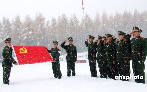 10月20日,武警黑龍江總隊牡丹江市支隊官兵在雪地重溫入黨誓詞。當(dāng)日,駐守祖國北疆的百余名武警官兵以“瑞雪迎盛會、雪地話黨章”為題,在雪地抒發(fā)愛國、愛黨情懷,暢談貫徹落實科學(xué)發(fā)展觀在警營的極大變化,共話黨的十七大修改黨章的重大意義。中新社發(fā) 陳維奇 攝