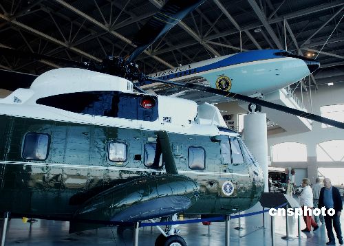 美國民眾十一月十九日參觀洛杉磯的里根總統(tǒng)博物館,大廳里展示當(dāng)年三任總統(tǒng)乘坐過的空軍一號專機和海軍一號直升機。中新社發(fā) 賈國榮 攝