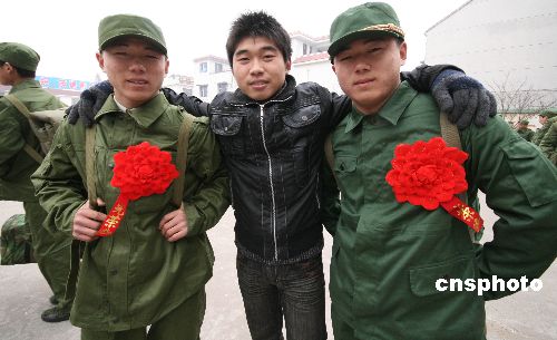 12月11日下午,家住安徽蒙城縣漆園辦事處城北村的雙胞胎兄弟鄭根林、鄭隨林同時參軍,起程開赴各自部隊開始多彩的軍營生活。鄭家兄弟自幼羨慕軍營生活,今年冬季征兵開始后,兄弟倆一起報名參加體檢和政審,并雙雙通過,被解放軍某部和武警某部批準(zhǔn)入伍,雙胞胎兄弟同時參軍入伍在當(dāng)?shù)貍鳛榧言。中新社發(fā) 胡衛(wèi)國 攝