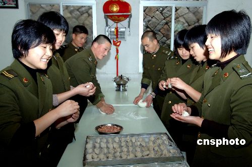 2月5日,駐閩某部女兵在軍營(yíng)營(yíng)房前高掛大紅燈籠,在軍營(yíng)食堂包餃子,喜迎新春佳節(jié)的到來(lái)。中新社發(fā) 劉可耕 攝