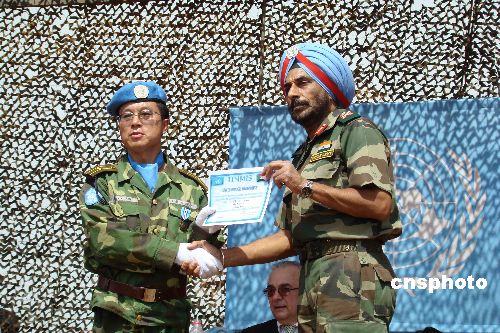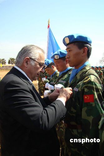 2月7日,聯(lián)合國駐蘇丹特派團(tuán)(聯(lián)蘇團(tuán))在中國的傳統(tǒng)節(jié)日--春節(jié)這一天舉行隆重的授勛儀式,破例提前兩個月為中國赴蘇丹瓦烏435名維和官兵授予聯(lián)合國“和平榮譽(yù)勛章”,以表彰他們在執(zhí)行任務(wù)時(shí)的卓越表現(xiàn)。聯(lián)合國秘書長駐蘇丹特別代表卡齊先生、聯(lián)蘇團(tuán)總司令里德爾中將從首都喀土穆趕來親自為維和官兵授勛并與官兵一起歡度春節(jié)。中新社發(fā) 甄玉改 攝