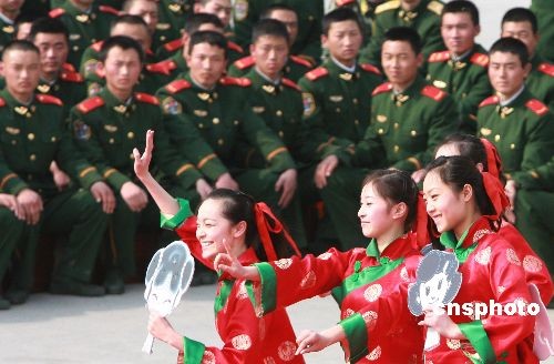 2月22日,武警江蘇總隊文工團演員為蘇州武警官兵表演舞蹈。當日,武警江蘇總隊政治部文工團組織“慰問抗雪救災一線官兵及新戰(zhàn)友專場文藝巡演”之首場演出活動,在蘇州武警支隊新兵營訓練場熱鬧開演。中新社發(fā) 蘇秀 攝