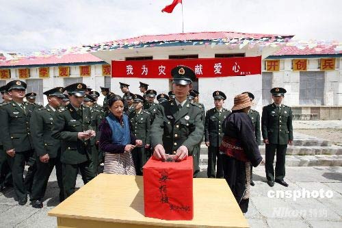 5月16日,駐守在海拔4500多米的西藏兵站部某大站黑河兵站官兵拿出津貼向四川災(zāi)區(qū)民眾獻上一份愛心。中新社發(fā) 樊厚東 攝