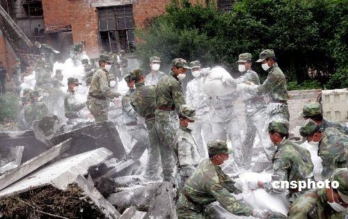 5月20日,濟南軍區(qū)某機步旅十二連官兵冒著中毒的危險,幫助四川省彭州市新科油化助劑有限公司緊急轉(zhuǎn)移增粘劑、阻燃劑等55噸有微毒的化學(xué)原料。官兵們在震塌的廢墟中仔細尋找、快速搶運,把散落的化工原料用袋子裝起來,為災(zāi)區(qū)挽回了300多萬元的損失。圖為官兵們搶運時的情景。中新社發(fā) 施文標 攝