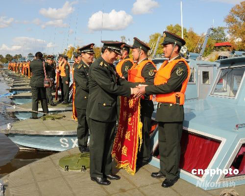 2008年10月4日,駐黑河某邊防巡邏艇大隊(duì)首批40余艘執(zhí)勤船艇及官兵,圓滿完成2008年度中俄界河黑龍江明水期巡邏執(zhí)勤任務(wù)后勝利凱旋。進(jìn)入10月,黑龍江上游江面即將結(jié)冰封凍,駐守在中俄三千里界江上的執(zhí)勤船艇官兵陸續(xù)返航。中新社發(fā) 邱齊龍 攝