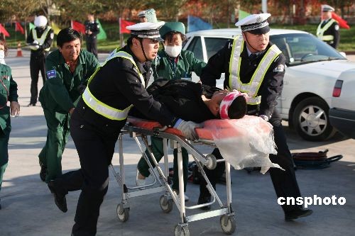 圖為演習(xí)中交警和120急救人員現(xiàn)場急救“傷者”。