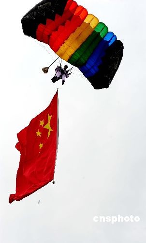11月4日,100條彩帶從天而降,四名跳傘隊員分別護衛(wèi)著國旗、八一軍旗、空軍軍旗和會旗徐徐飄落,成為中國航展開幕式上一道靚麗的風景線。 擔負跳傘表演任務(wù)的是空軍八一跳傘隊的27名男女運動員,他們表演了“喜降彩帶”、“航空盛典”、“東方之珠”、“金龍飛舞”、“空中彩虹”和“仙女下凡”六個項目。中新社發(fā) 沈玲 攝