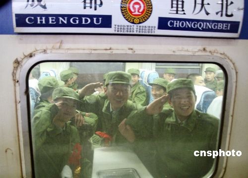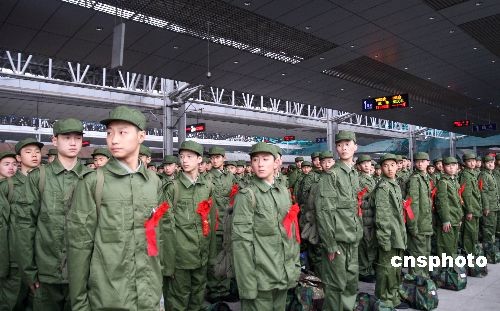 11月19日下午,重慶地區(qū)2008年冬季招兵征召的首批915名進(jìn)藏新兵在重慶火車北站登上列車,前往成都受訓(xùn)準(zhǔn)備進(jìn)藏服役。據(jù)稱,本次前往西藏服役的新兵8成以上達(dá)到高中以上文化程度,平均年齡為19歲,來自重慶大足、璧山、渝北等17個(gè)區(qū)縣。中新社發(fā) 郭晉嘉 攝