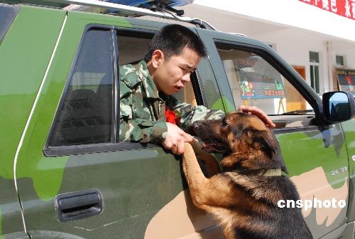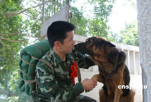 十一月二十四日,武警福建總隊(duì)直屬支隊(duì)的訓(xùn)犬員張世均與息息相處五年的無(wú)言戰(zhàn)友“飛虎”依依惜別。又到老兵退伍的日子,在武警福建總隊(duì)服役期滿的三千多名老兵,開(kāi)始踏上返鄉(xiāng)的路程。中新社發(fā) 曾朝群 攝