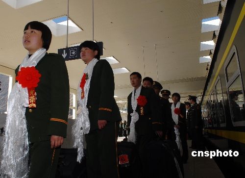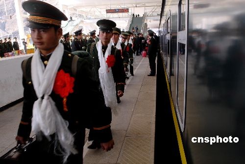 11月25日,駐藏某部及武警西藏森林總隊(duì)的退伍老兵們?cè)趹?zhàn)友和拉薩當(dāng)?shù)厝罕姷臍g送下踏上了回家的青鐵列車。從有關(guān)部門獲悉,拉薩火車站已經(jīng)為新老兵準(zhǔn)備了充足的車輛和票額。另據(jù)了解,今年鐵路新老兵運(yùn)輸將繼續(xù)執(zhí)行購票、行李托運(yùn)、進(jìn)出站和中轉(zhuǎn)換乘“四優(yōu)先”原則,為新老兵排憂解難、提供方便,確保新老兵乘車有票、上車有座,退伍老兵在旅客列車上用餐也將享受優(yōu)惠。 中新社發(fā) 龍昊 攝