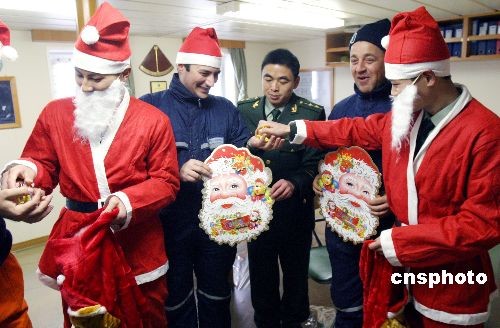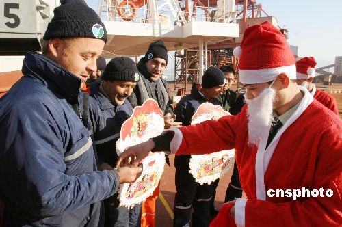 12月23日,江蘇公安邊防總隊連云港邊防檢查站的戰(zhàn)士扮成“圣誕老人”來到停泊在連云港口岸的外輪上,為外籍船員送去祝福和圣誕禮物,讓外籍船員在中國感受圣誕快樂。中新社發(fā) 王健民 攝