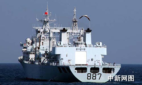 “?凇碧枌(dǎo)彈驅(qū)逐艦新春與“微山湖”號綜合補給艦在海上進行補給時,一只海鷗從“微山湖”艦上空飛過。中新社記者 孫自法 攝