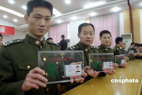 2009年2月26日,濟(jì)南警備區(qū)、濟(jì)南市公安局聯(lián)合舉行駐濟(jì)部隊(duì)現(xiàn)役軍人居民身份證首發(fā)儀式。自此,濟(jì)南市為駐濟(jì)部隊(duì)申領(lǐng)發(fā)放具名身份證工作正式啟動(dòng)。此舉將對(duì)部隊(duì)人員辦理儲(chǔ)蓄、保險(xiǎn)、買(mǎi)車(chē)、購(gòu)房等涉及個(gè)人權(quán)益事物時(shí)帶來(lái)便捷。中新社發(fā) 龔輝 攝