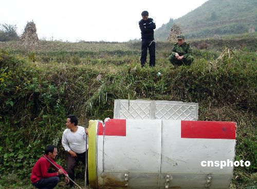 10月26日下午6時,長征三號甲運(yùn)載火箭殘骸外殼已拆卸完畢,有關(guān)部門在組織交通車輛和人員裝載回收。10月24日18時05分,我國在西昌衛(wèi)星發(fā)射中心用長征三號甲運(yùn)載火箭將嫦娥一號成功送入太空。18時16分火箭殘骸安全按計劃墜落在貴州預(yù)定范圍。殘骸落于一民房,殘骸外殼落于玉米地,無人員受傷。中新社發(fā) 易勝武 攝
