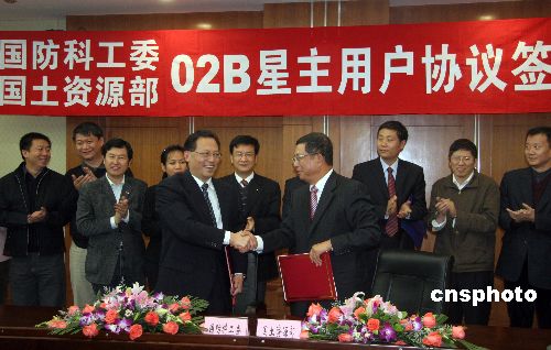十月二十九日下午,中國國防科學(xué)技術(shù)工業(yè)委員會(huì)與國土資源部簽署協(xié)議,后者正式成為中巴地球資源衛(wèi)星○二B星主用戶,雙方將以此為契機(jī),攜手推動(dòng)并充分發(fā)揮中巴地球資源衛(wèi)星○二B星的應(yīng)用效益。國防科工委副主任兼國家航天局局長孫來燕(左)、國土資源部副部長李元代表雙方簽署《國防科工委、國土資源部關(guān)于中巴地球資源衛(wèi)星○二B星主用戶機(jī)制試點(diǎn)的協(xié)議》。中新社發(fā) 孫自法 攝