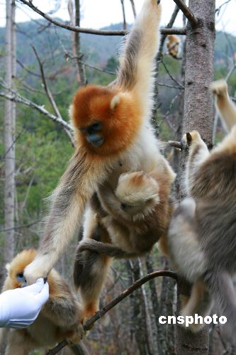 圖為11月1日,拍攝于湖北省神農架大龍?zhí)吨信c人和諧相處的金絲猴。據(jù)了解,在金絲猴的食譜中,植物種類多達172種。為讓金絲猴安度寒冬,科研人員嘗試著讓金絲猴接受別的食物。經過5個月的磨合,蘋果成了神農架金絲猴的美食。神農架給川金絲猴人工補食實驗的成功,既是對川金絲猴進行保護的寶貴經驗,也是中國珍稀野生動物保護與研究的一個重大突破。