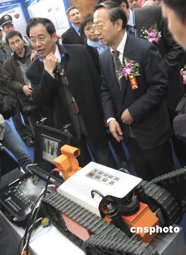 11月6日上午,“第十二屆中國國際煤炭采礦技術(shù)交流及設(shè)備展覽會(huì)”在北京全國農(nóng)業(yè)展覽館開幕。開幕式上,中國國家安全監(jiān)督管理總局局長(zhǎng)李毅中來到1號(hào)展廳,在中國研制的首臺(tái)“緊急搶險(xiǎn)探測(cè)機(jī)器人”前,詢問有關(guān)技術(shù)指標(biāo)。這臺(tái)由哈工大機(jī)器人研究所與唐山開誠公司共同研制的有線遙控機(jī)器人,可以在遇難、遇險(xiǎn)礦井中行走500米距離,并可以爬坡、越障,到達(dá)指定地點(diǎn),并探測(cè)井下有毒氣體、溫度、風(fēng)速數(shù)據(jù),對(duì)遇險(xiǎn)礦工地段進(jìn)行探測(cè)救險(xiǎn)。中新社發(fā) 鄒憲 攝