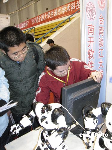 11月15日,第十屆“挑戰(zhàn)杯”飛利浦全國大學(xué)生課外學(xué)術(shù)科技作品競賽決賽在南開大學(xué)開幕。在學(xué)生科技作品展示環(huán)節(jié)中,由南開大學(xué)與臺灣淡江大學(xué)合作研發(fā)的“mychannel虛擬電視臺”和“桌面機器人輔助多模即時交流平臺”格外引人關(guān)注。淡江大學(xué)參賽隊指導(dǎo)教師蕭瑞祥介紹:“從決定合作到作品完成,經(jīng)歷了將近一年時間。中新社發(fā) 田齊 攝