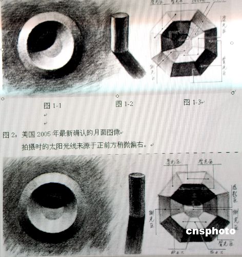 | 2007年12月6日,海南在京的一位畫家從光學(xué)角度找到中美兩“月亮”鮮明差別。中國嫦娥首幅月球圖像抄襲美國的傳言,在網(wǎng)上一度鬧得沸沸揚揚,海南省畫家、超常創(chuàng)意專家于廣勝在北京,反復(fù)對照中美兩圖琢磨研究,從光學(xué)角度發(fā)現(xiàn)兩幅圖象有著“更加鮮明的差別”,6日早晨他發(fā)現(xiàn)兩幅圖像是在不同的光源下拍攝的,從另一側(cè)面有力證明了我國嫦娥傳回圖像的真實性。于廣勝說,這一證據(jù)是普通大眾不易發(fā)現(xiàn)的,但通過他所手繪的幾幅圖,即可讓普通大眾一目了然。同時,凡是對光學(xué)有所研究或通曉繪畫用光、攝影和攝像用光的人們,自然明白其理。為了便于廣大讀者理解,他把地球上的環(huán)形山簡化為內(nèi)凹外凸的圓臺(圖1-1、2-1),以顯現(xiàn)不同光線來源下的不同光影效果;由此,又進(jìn)一步簡化為內(nèi)凹外凸八棱臺(圖1-3、2-3)并標(biāo)注了光線的來源和受光、測光、背光區(qū)域;同時,又畫了一個圓柱體(1-2、2-2)以顯現(xiàn)不同光照角度下的不同投影方向。通過兩組手繪圖,中國與美國公布的兩張圖像在拍攝時,太陽光照射月球角度明顯不同,至少左右相差42度左右。中國拍攝時的太陽光線來源于左前方,而美國拍攝時的太陽光線來源于正前方稍微偏右。于廣勝說,稍有電腦平面制作、攝影和攝像后期制作知識的人們都明白,圖片與圖片的任意組合拼接是輕而易舉的,但要想把圖片中各個圖像所有細(xì)節(jié)的光影全部改變是不可能的,“由此可見,我國嫦娥傳回的圖像其真實性是不容質(zhì)疑了。”相關(guān)鏈接:12月2日,中國探月工程首席科學(xué)家、中國科學(xué)院院士歐陽自遠(yuǎn)做客上海“文匯講堂”,對關(guān)于“嫦娥首幅月球圖像抄襲美國”的傳言作出澄清:“嫦娥傳回的圖像確實是真實的,是經(jīng)過非常復(fù)雜的拍攝、傳輸、接收、處理過程后得到的,并且與美國所拍的圖像有細(xì)微差別”。我國嫦娥一號衛(wèi)星所攝的月面圖像上,某個地方有兩個小坑,而美國2005年最新確認(rèn)的月面圖像上,同樣的地方只有一個小坑。中新社發(fā) 善平 攝